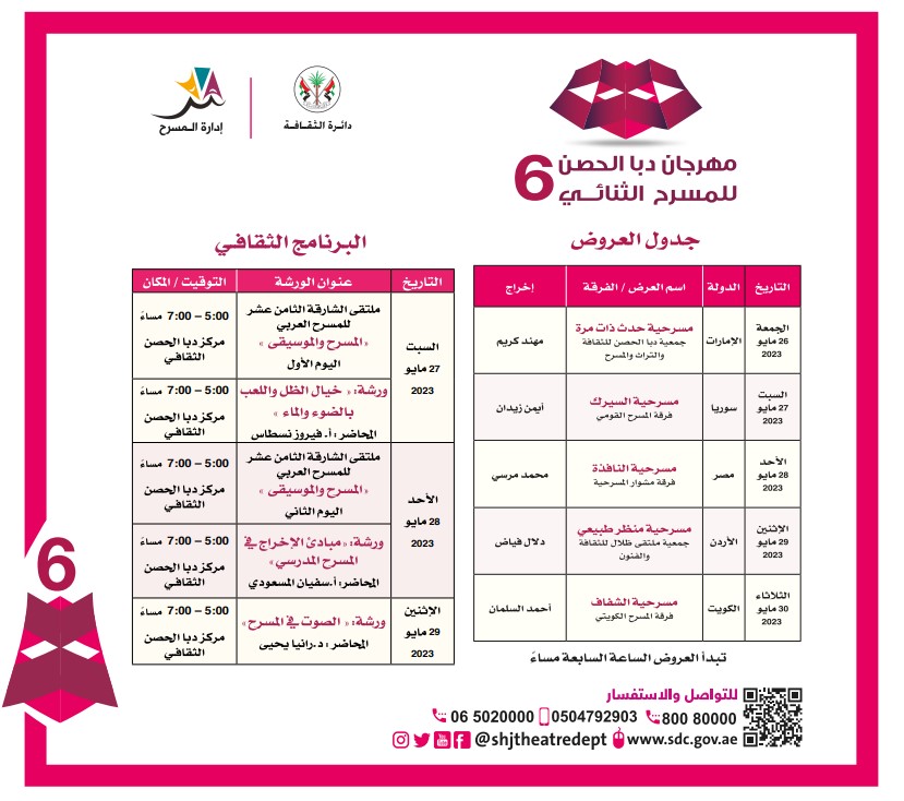 «مهرجان دبا الحصن للمسرح الثنائي - الدورة 6»، تنظمه إدارة المسرح بدائرة الثقافة في الشارقة، ويحتضن فعالياته المركز الثقافي لمدينة دبا الحصن.