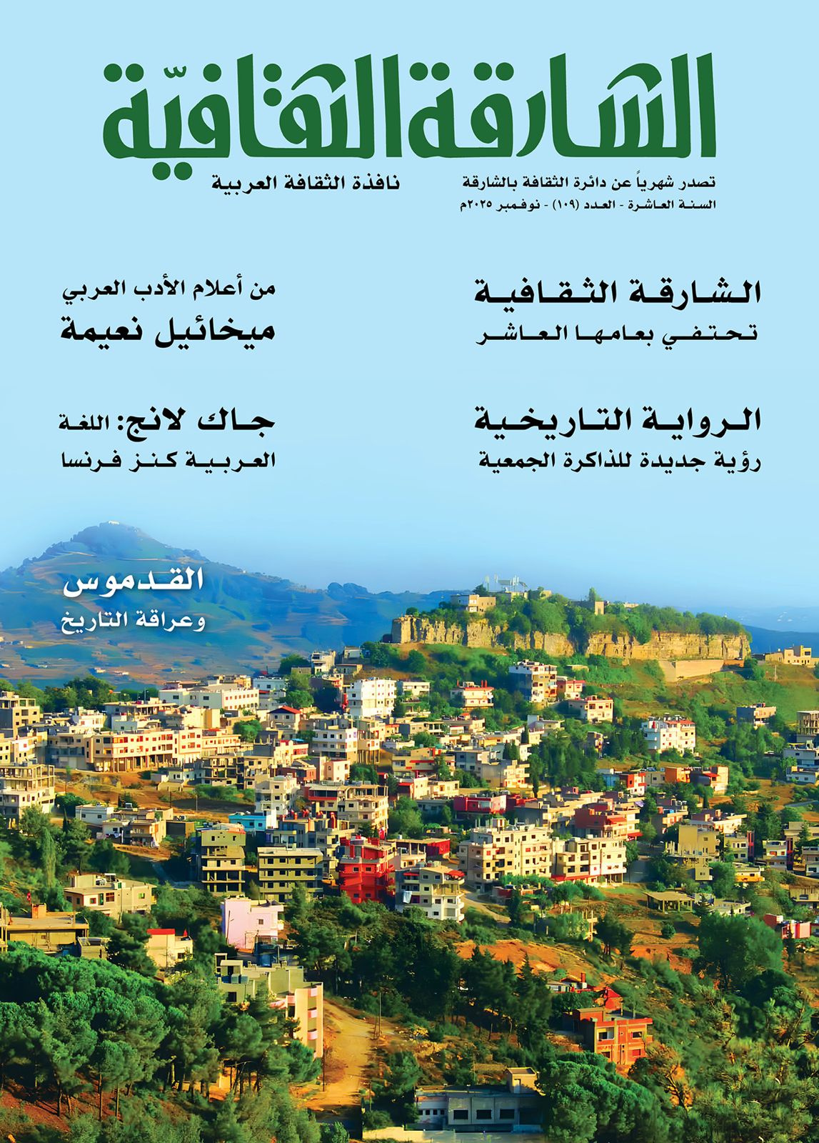 صدر العدد (109)، نوفمبر (2025م)، من مجلة "الشارقة الثقافية"، وقد تضمن مجموعة متميزة من الموضوعات والمقالات والحوارات، في الأدب والفن والفكر والسينما والتشكيل والمسرح والتراث. وقد جاءت الافتتاحية تحت عنوان (معارض الكتاب والعلاقة المعرفية)، مؤكدة أنّ معرض الشــارقة للكتاب، فــي دوراته منــذ بدايــة الثمانينيات، رسخ مقولة أن الأمر لم يعد مقتصراً على القراءة واقتناء الكتب واكتناز المعلومات، وإنّما أصبحت هناك علاقة دافئة بين القارئ والكتاب، تتخطّى عملية الثقافة والمعرفة، وترقى إلى درجة المشاركة والتأثير والتعبير.. وهو ما يسهم في صناعة التحوّل الكبير على المستويات كافة في خدمة الإنسانية ومصلحة البشرية، نتيجة التغيير في الخطاب والحوار والسلوك والعلاقات واتخاذ القرارات، علاوة على الإنتاج والابتكار والإبداع.