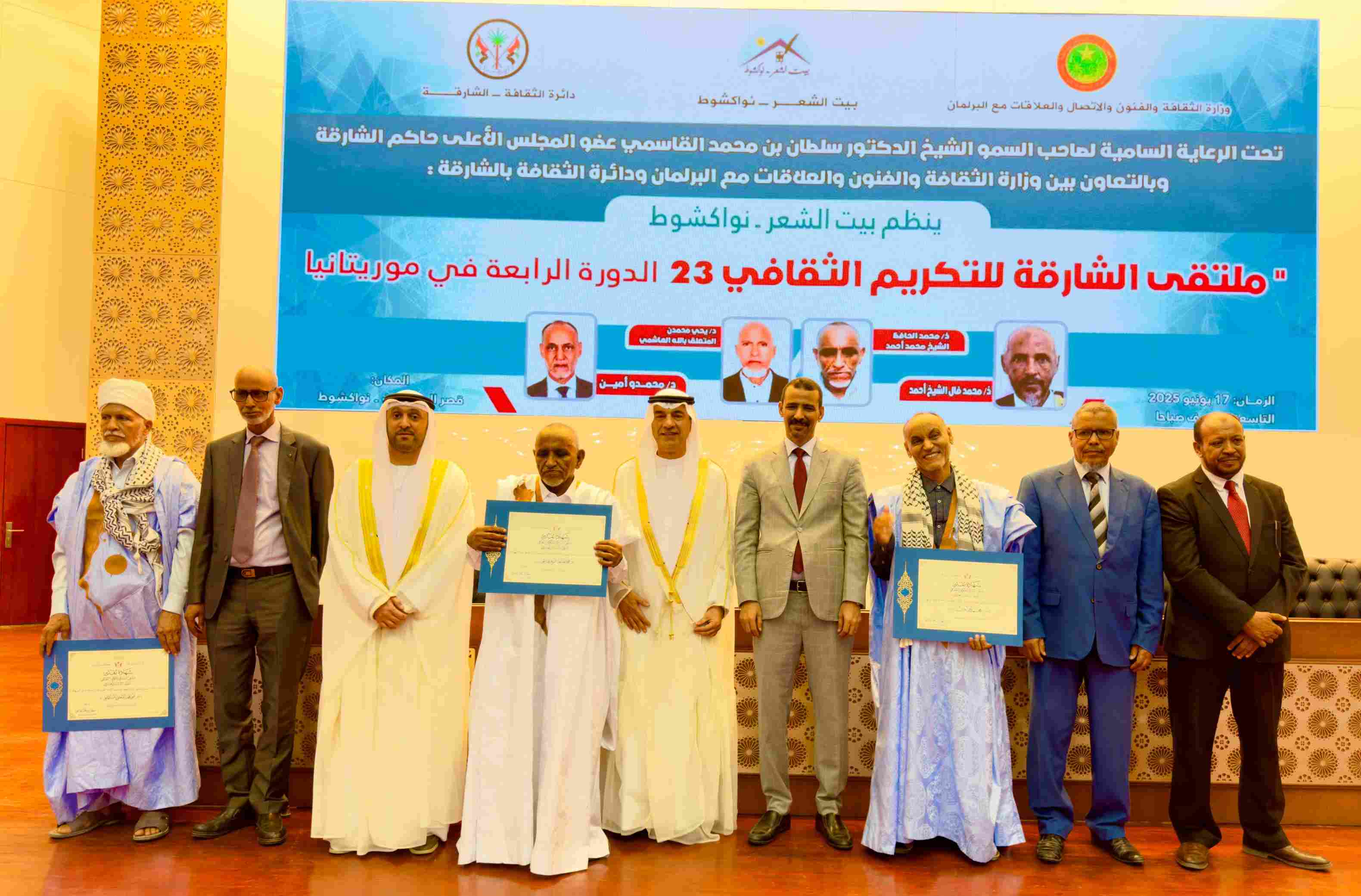 تحت رعاية صاحب السمو الشيخ الدكتور سلطان بن محمد القاسمي عضو المجلس الأعلى حاكم الشارقة؛ شهدت العاصمة الموريتانية نواكشوط احتفاءً رسمياً وثقافياً يرسّخ قيم الوفاء للمبدعين ويكرّس مكانتهم، وذلك ضمن النسخة الثالثة والعشرين من ملتقى الشارقة للتكريم الثقافي الذي نظّمته دائرة الثقافة في الشارقة بالتعاون مع وزارة الثقافة والفنون والاتصال والعلاقات مع البرلمان الموريتانية، حيث تم تكريم أربعة من أعلام الأدب الموريتاني تقديراً لعطائهم وإسهامهم في إثراء الحياة الثقافية، وهم: الشاعر محمد فال عبد اللطيف، والأكاديمي في علم اللسانيات د. يحيى الهاشمي، والباحث اللغوي د. محمدو أمين، والشاعر محمد الحافظ ولد أحمدو.