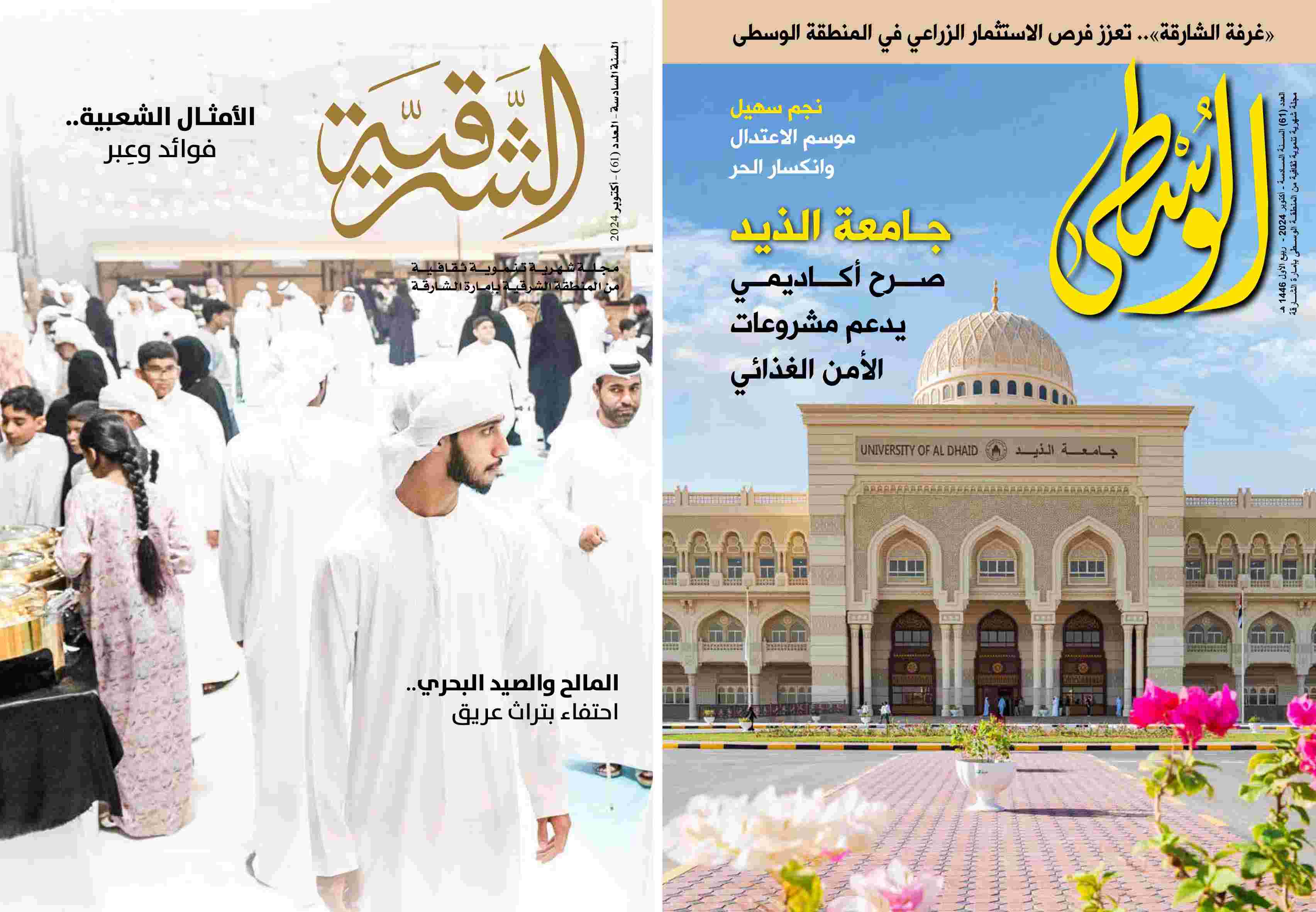 صدر عن دائرة الثقافة في الشارقة العدد «61» من كل من مجلة «الوسطى» ومجلة «الشرقية»، عن شهر أكتوبر 2024، واشتمل العددان على موضوعات سلطت الضوء على تفاصيل المشهد التطويري المتنامي في المنطقتين الوسطى والشرقية.