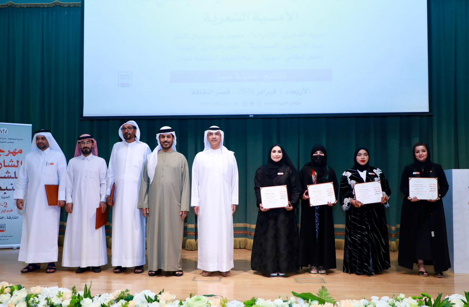 The Sharjah Nabati Poetry Festival continued the events of its 20th edition with a poetry evening held at the Cultural Palace in Sharjah, in the presence of H.E. Abdullah bin Mohammed Al Owais, Chairman of the Department of Culture in Sharjah; Mr. Mohammed Ibrahim Al Qaseer, Director of Cultural Affairs at the Department; and Butti Al Mathloum, Director of Al Heera Literary Council, along with a number of Nabati poetry enthusiasts and cultural figures. The readings varied between love poetry, expressions of national pride, and emotional reflections.